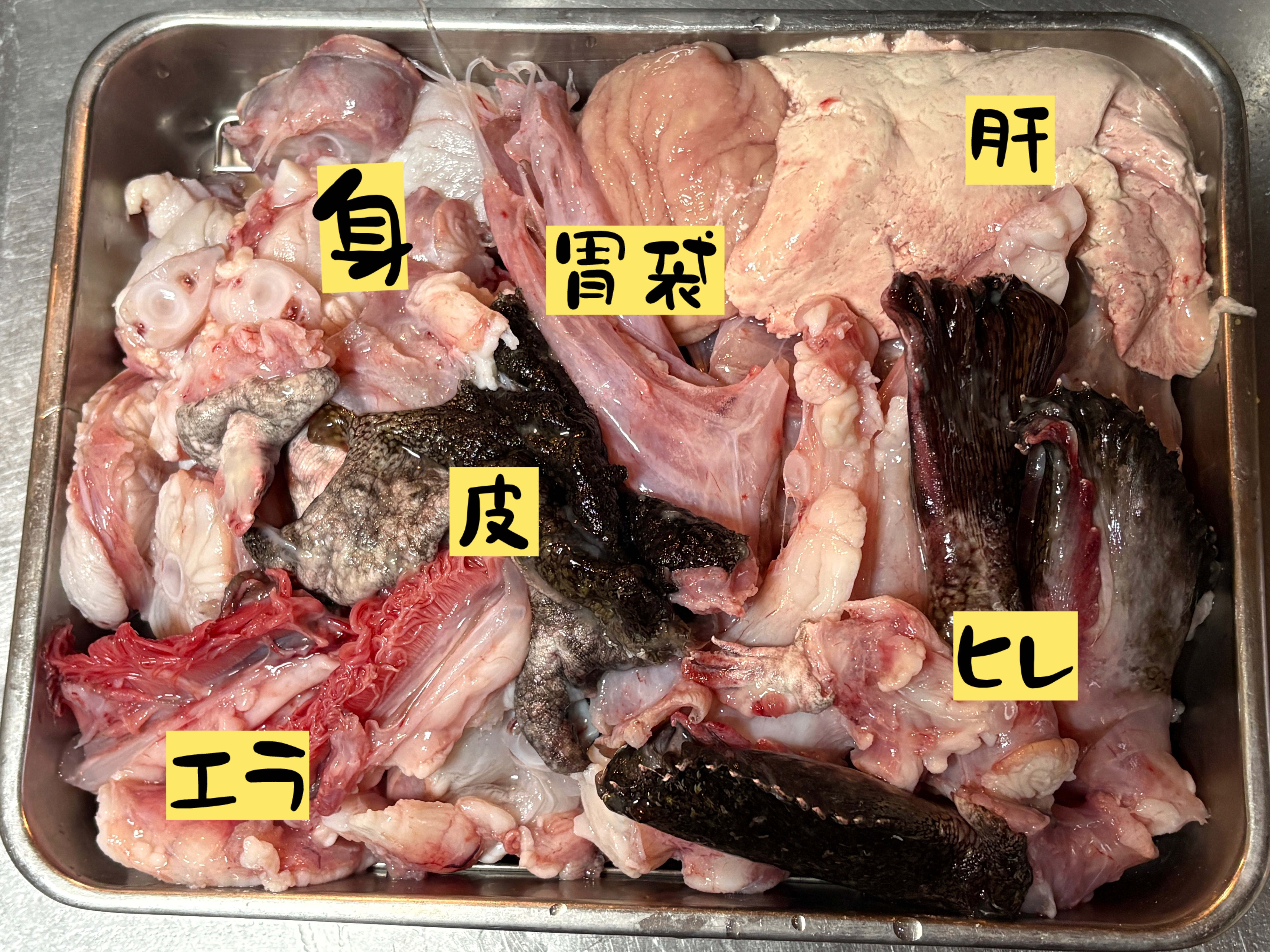 石巻からアンコウを仕入れました。 アンコウは捨てるところがありません。 アンコウの七つ道具と呼ばれ、王道のあん肝から、皮、柳肉(身)、とも(ひれ)、えら、水袋(胃袋)布(卵巣)…今回はオスのアンコウだったので布はなかったけどあん肝もでかくてみんな喜んでました。 一気に寒完売でした。
